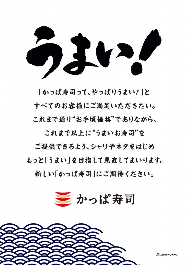 ・「うまい!」の筆文字を核にした、宣言型ロゴ・キービジュアル・コピー設計・「お手頃価格はそのままに、これまで以上に“うまい寿司”へ」のメッセージ構成(品質改善の約束を明文化)・「安い」だけではない“味への自信”が伝わり、ブランド印象の再認識・離反層に対して「変わったなら行ってみたい」という再来店の動機づけ・競合比較の中で店頭での認知・記憶に残りやすくなった・「シャリ・ネタを見直す」という具体性が、期待感と信頼感の両方を補強した
